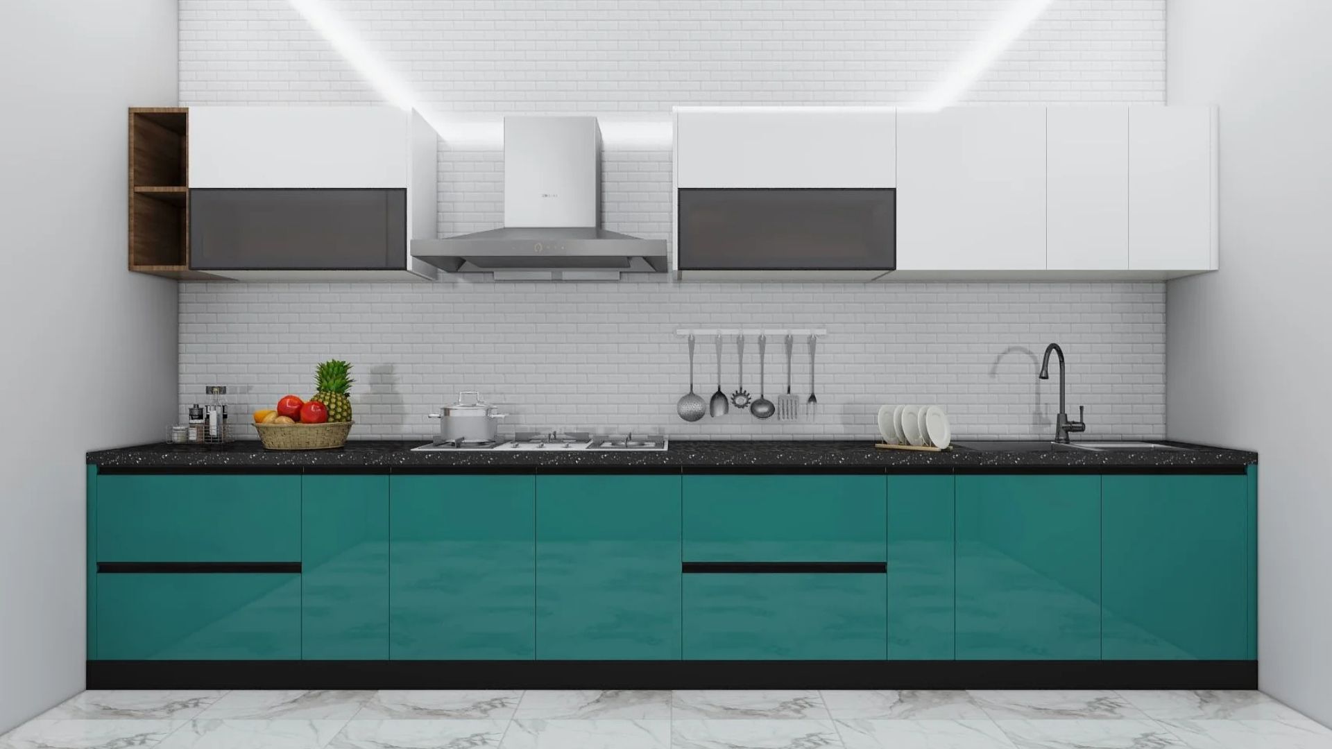The straight-line modular kitchen is a minimalist's dream. Ideal for narrow or compact spaces, this layout features a single linear setup, where everything is neatly arranged along one wall. This configuration makes the best use of limited space while ensuring that all key elements—such as cooking, cleaning, and preparation zones—are within close reach.