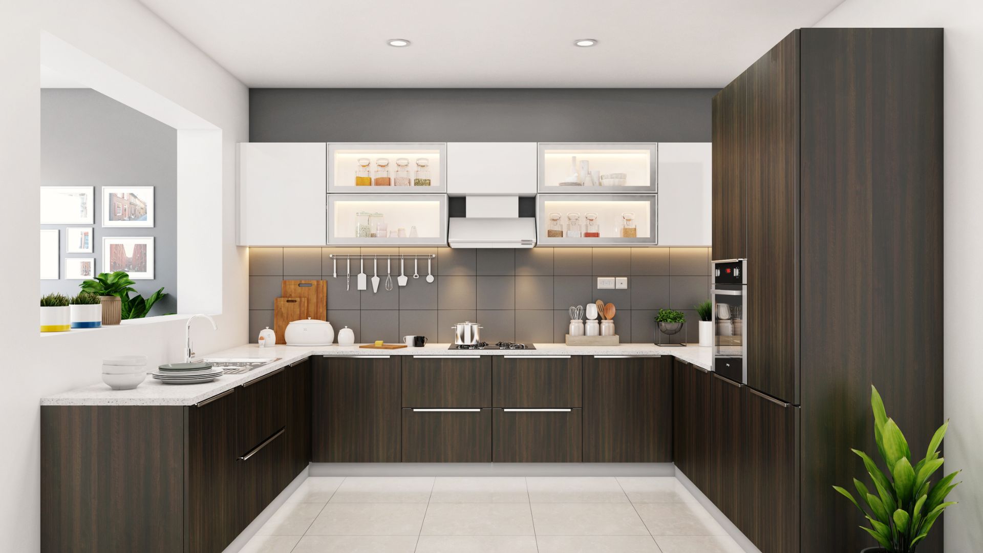 The L-shaped modular kitchen is ideal for homes with limited space, offering an efficient workflow with its smart corner design. This layout features two adjoining walls, creating an open and airy cooking area. Perfect for small to medium-sized kitchens, it maximizes corner space while providing ample room for storage, cooking, and preparation.
